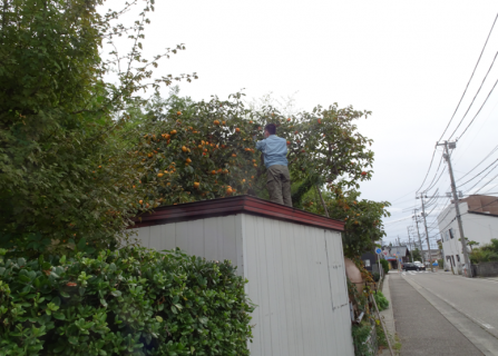 若いメンバーはひょいと小屋の上に登って採りづらい上の方の柿を収穫してくれました。
