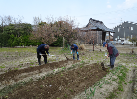 夏の梅干し作りに向けて2つの畝にシソの種を蒔いてきました。また、まちかど館第二の玄関前に植えるお花の苗も購入。まちかど館関係者がきれいに植えてくださいました。